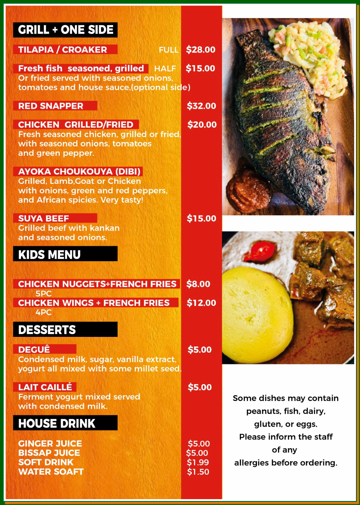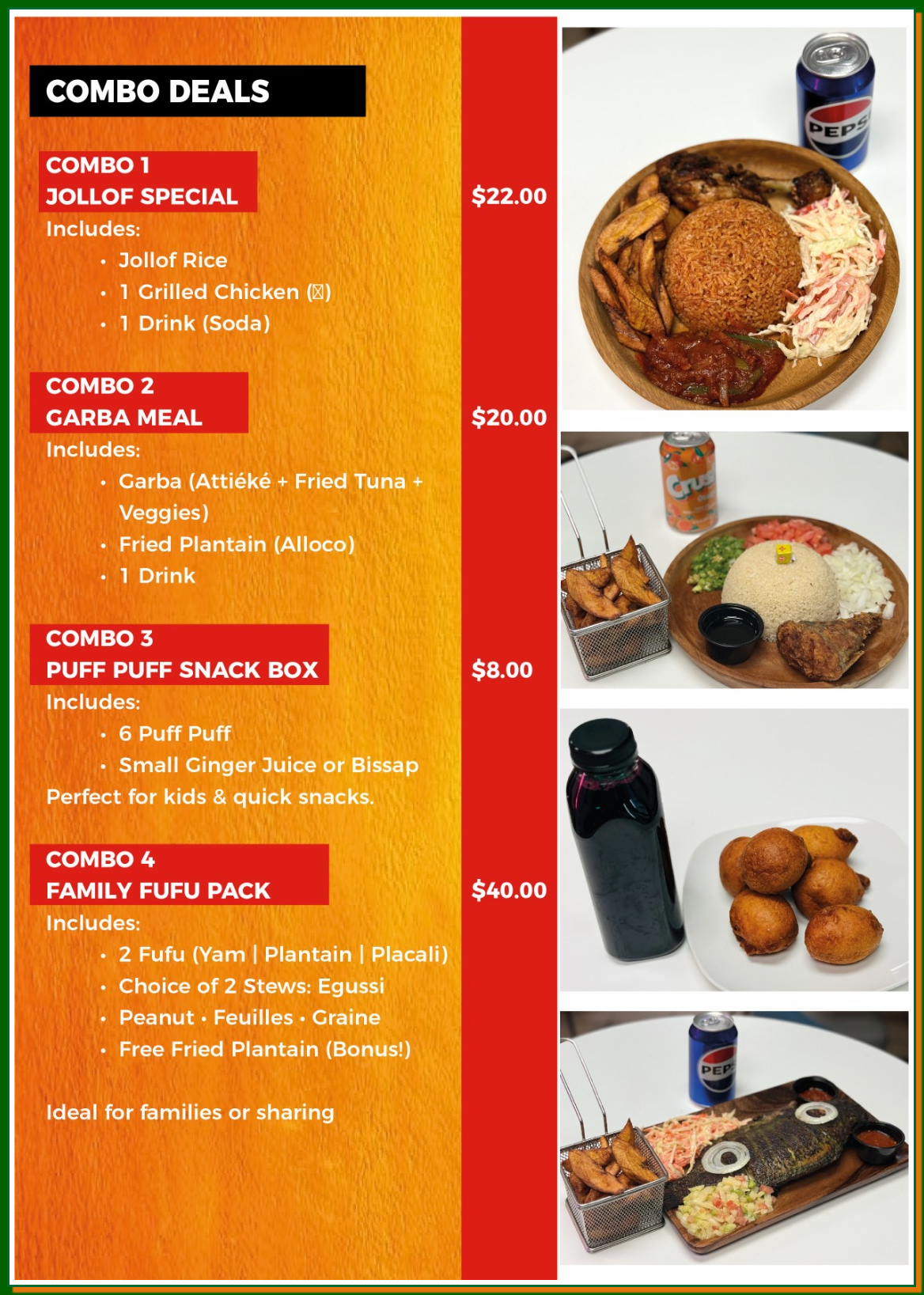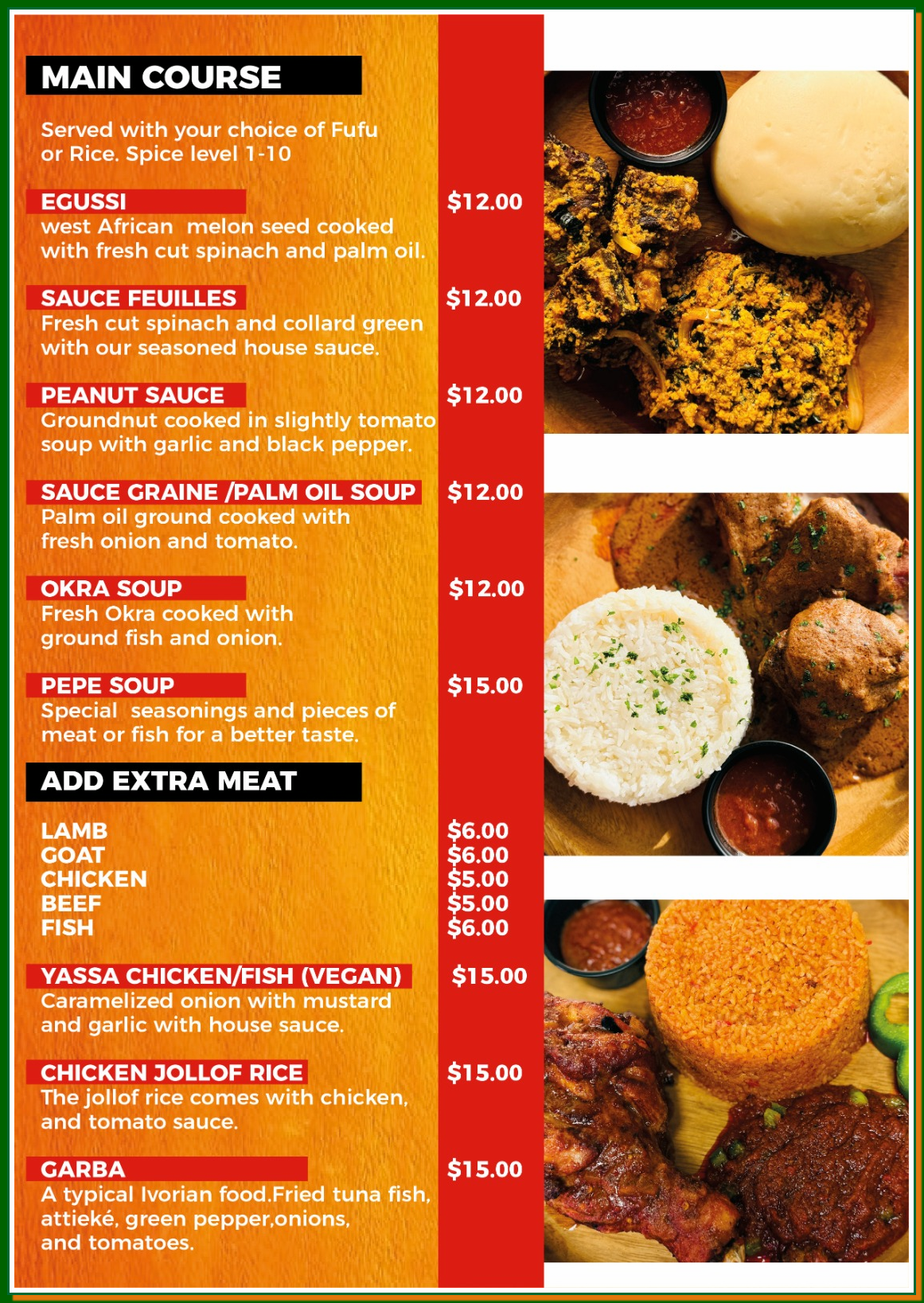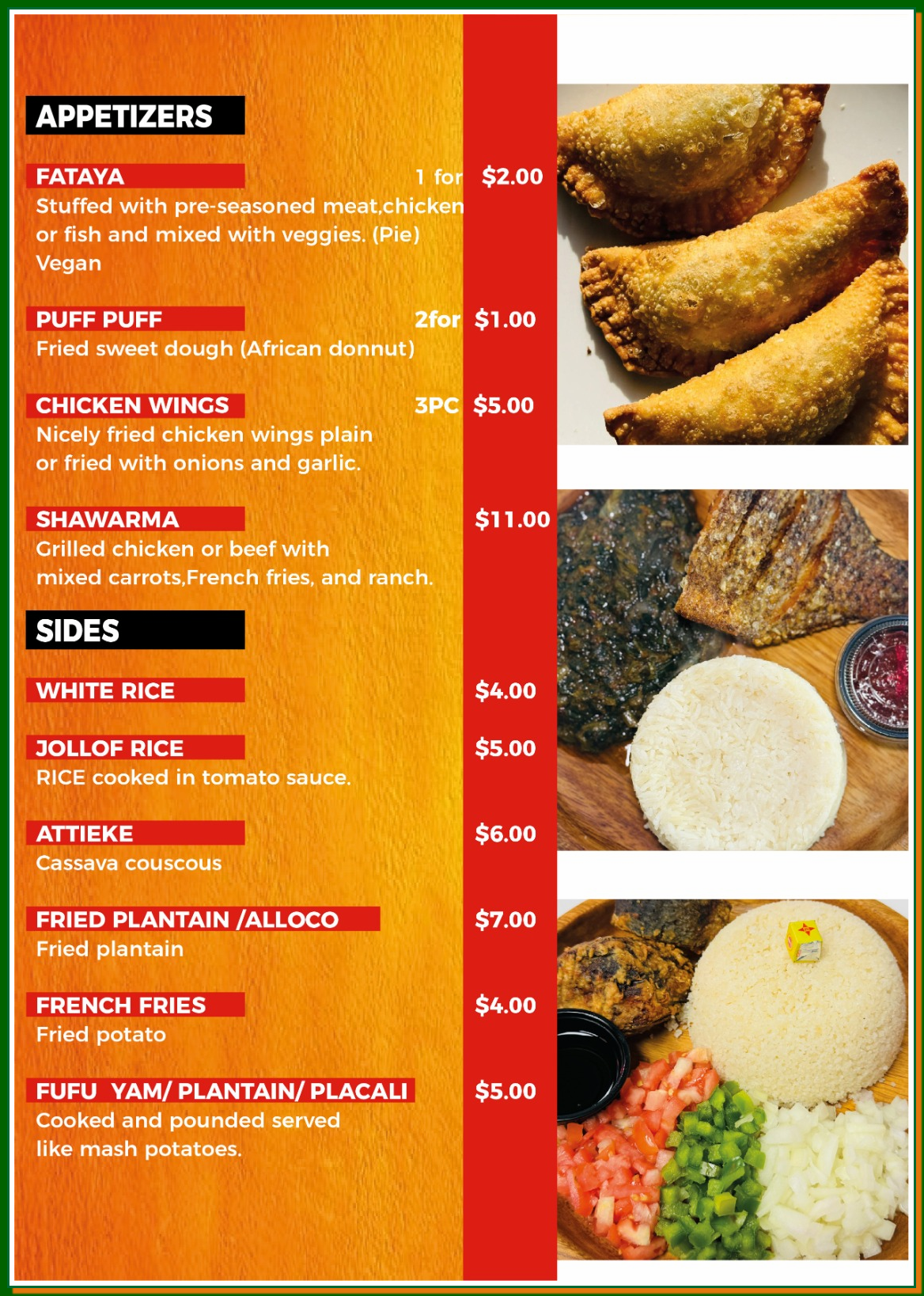 Our restaurant only uses the finest ingredients and preparation techniques. Explore a new land right in your hometown with our traditional West African Menu. Suitable for meat lovers, and seafood savants, and there are plenty of options for our vegan and vegetarian customers!